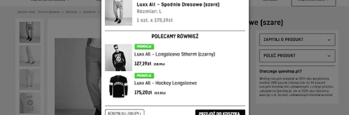 Sekcja “Polecamy również / Podobne produkty” to miejsce, gdzie możesz zastosować strategię up-sellingu. Jeżeli Twój system e-commerce posiada taką funkcję, zaprogramuj go, aby w tym miejscu rekomendował produkty z tej samej podkategorii, ale nieco droższe.